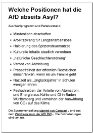 Wer sich wundert, dass davon in der Presse nicht viel zu sehen war, kann die meisten diese Punkte im Wahlprogramm der AfD Baden-Württemberg und in den Referenzen der Aufstellung von Campact nachlesen.