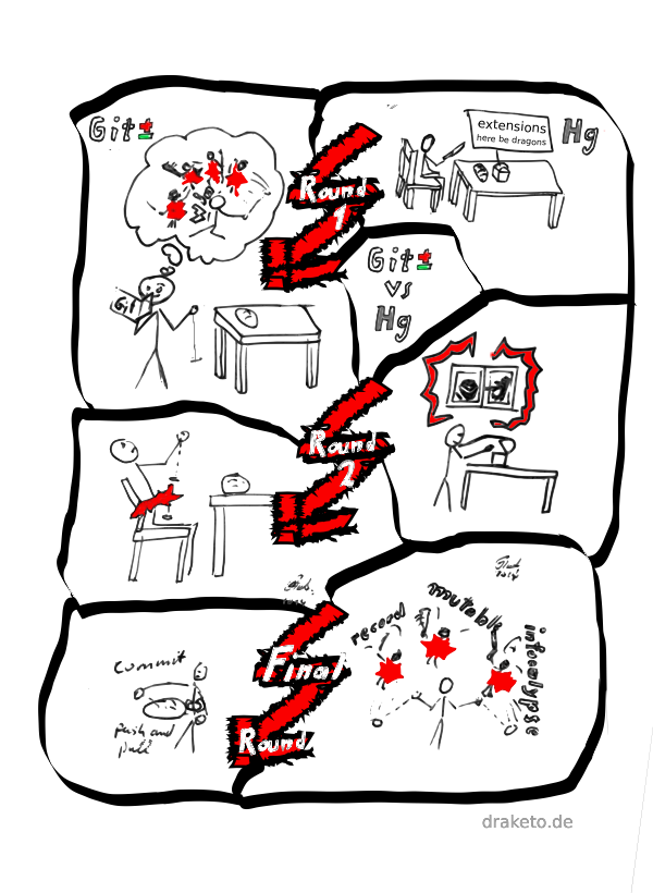 All the graphics in this strip are available under free licenses: creative-commons attribution or GPLv3 or later — you decide which of those you use. If it is cc attribution, call me Arne Babenhauserheide and link to this article. You’ll find all the sources as well as some preliminary works and SVGs in git-vs-hg-offensive.tar_.gz or git-vs-hg-offensive.zip (whichever you prefer)